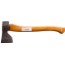 Snickaryxa med lång tunn egg. Blästrad yxskalle som klarlackats före montering av hickoryskaft. Skaftning med både trä- och metallkil. Borrat upphängningshål.